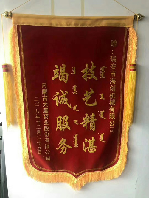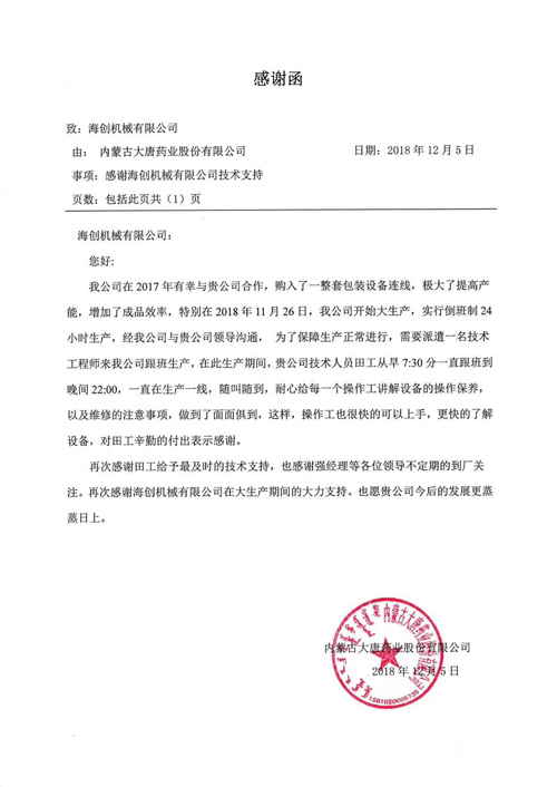 感谢大唐药业对我们瑞安市海创机械有限公司设备的认可和售后服务的肯定,以及对我们公司的大力支持。